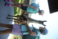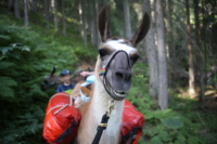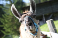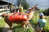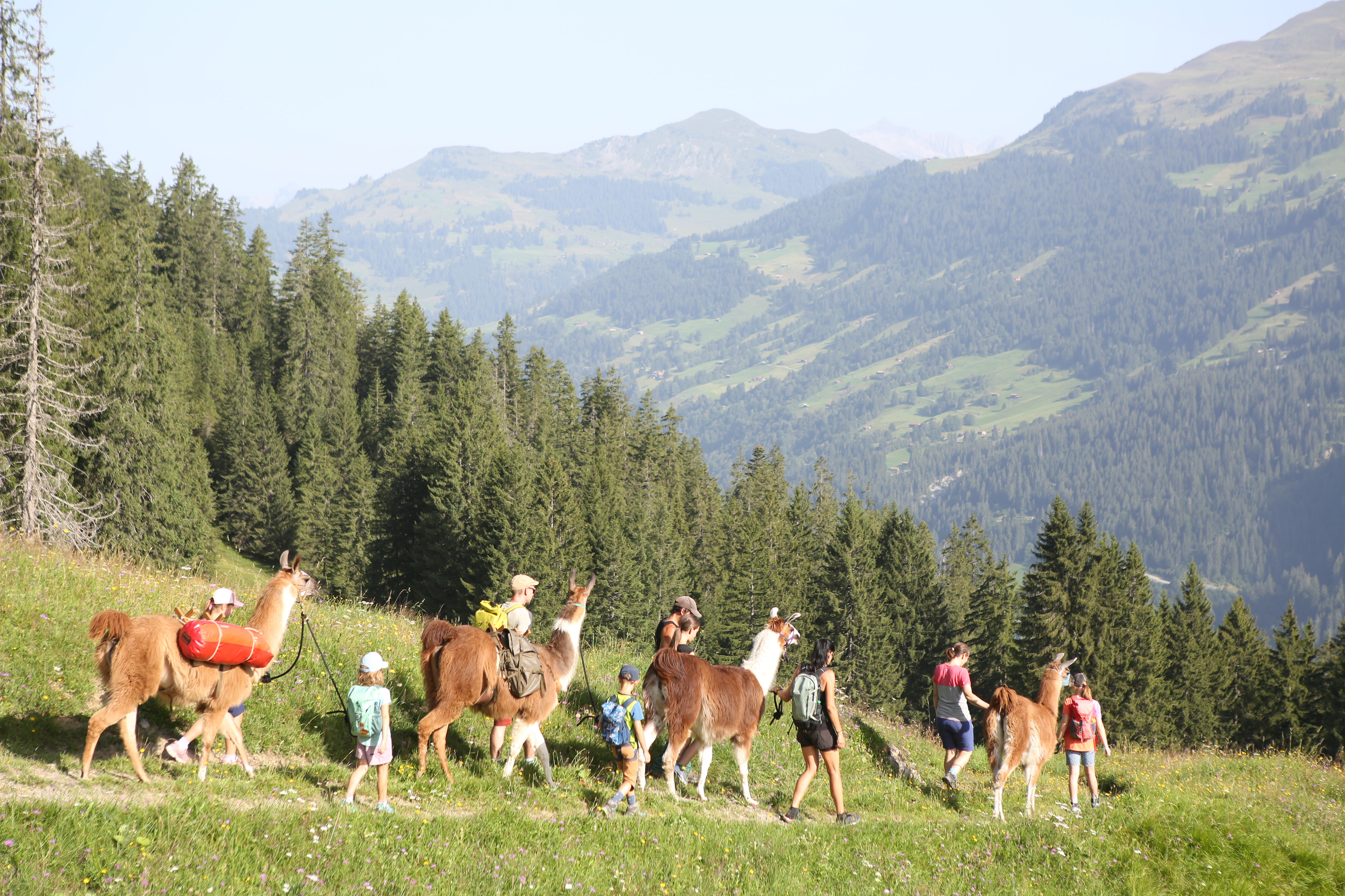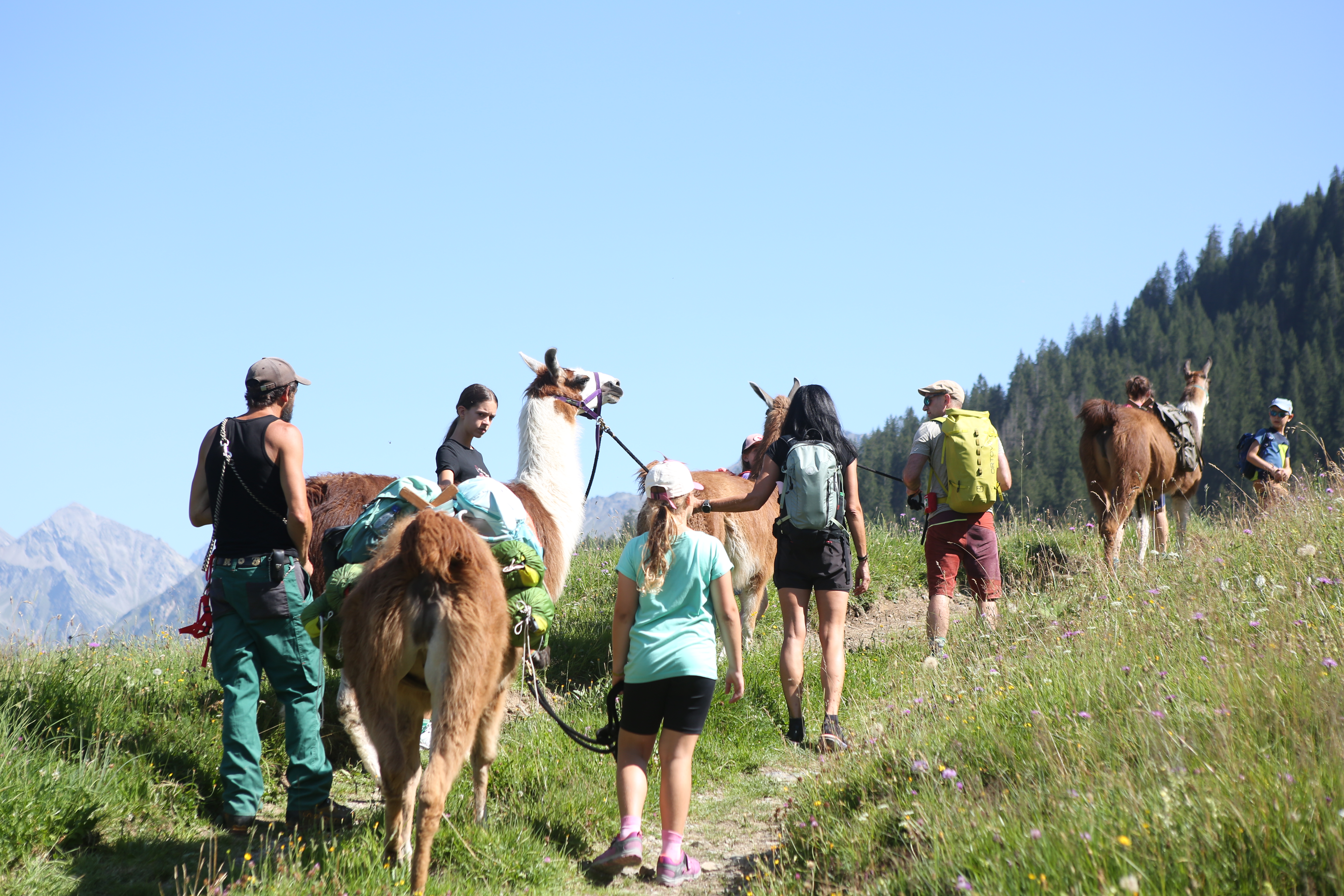 Sobald alle mit dem Ablauf vertraut sind, wird das Hauptgepäck – Zelte, Schlafsäcke und Isomatten – auf die Tiere verteilt und der Rest wird mit einem Begleitfahrzeug auf die Alm hochtransportiert. Pro Erwachsenem mit einem Kind steht ein Lama zur Verfügung, das ihr am Strick führt. Ganz ohne Eile beginnt unser Lama-Trekking durch die malerische Natur Graubündens. Mensch und Tier finden langsam zueinander, das Tempo ist gemütlich, der Weg führt über einfache Bergpfade – ideal für Familien mit Kindern ab etwa 7 Jahren.