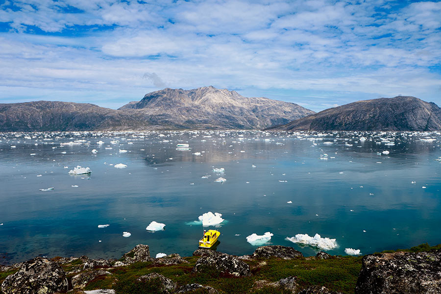 Mit einem kleinen Hochgeschwindigkeitsboot (max. 12 Gäste) fahren wir durch den Ataa-Sund zum aktiven, kalbenden Eqi-Gletscher.