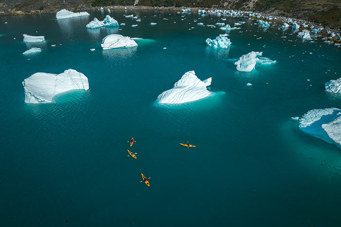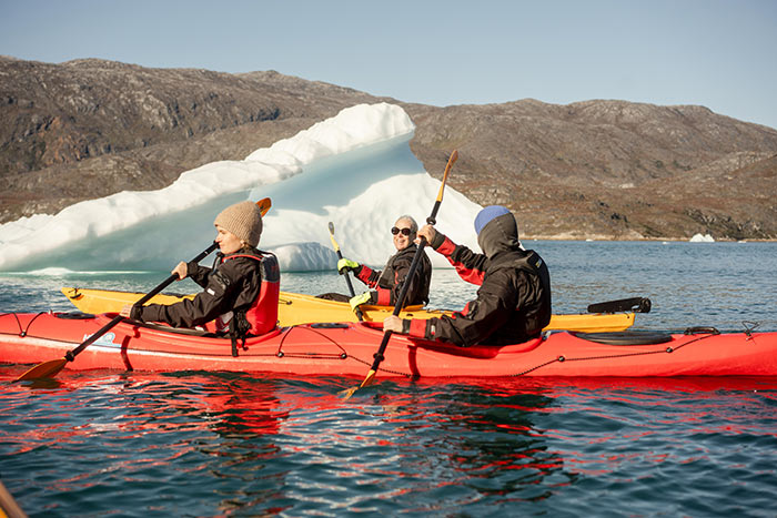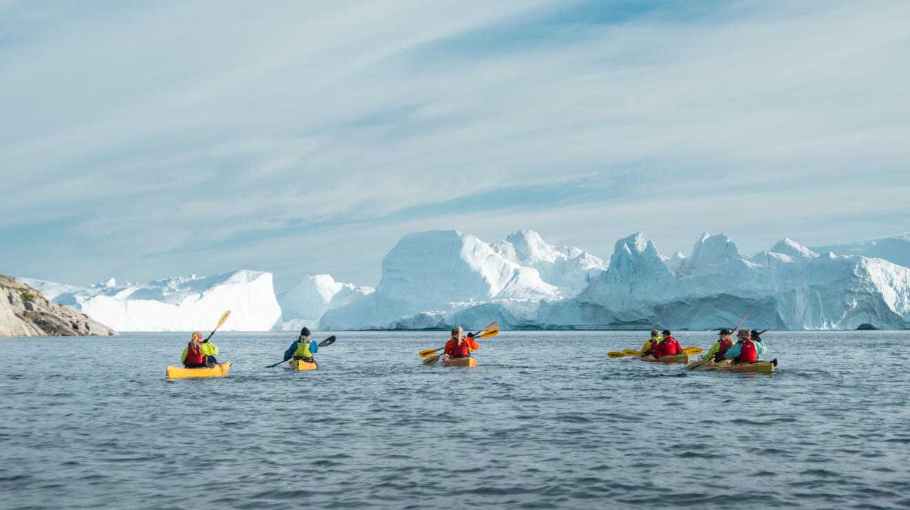 In Zwei-Personen-Kajaks, ausgestattet mit Trockenanzügen und Sicherheitsausrüstung, erkunden wir die Eisberge des UNESCO-Weltkulturerbes.